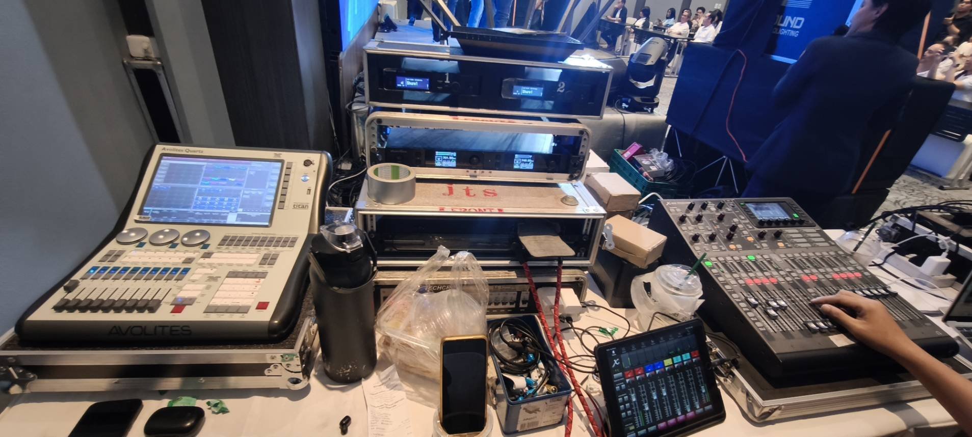 ทีมงานได้ออกแบบ ระบบไฟเวที ให้สอดคล้องกับบรรยากาศงานเลี้ยงในโรงแรม โดยใช้โทนแสงสีฟ้าและม่วง เพื่อเพิ่มความหรูหราและความทันสมัยให้กับพื้นที่เวทีและภายในห้อง